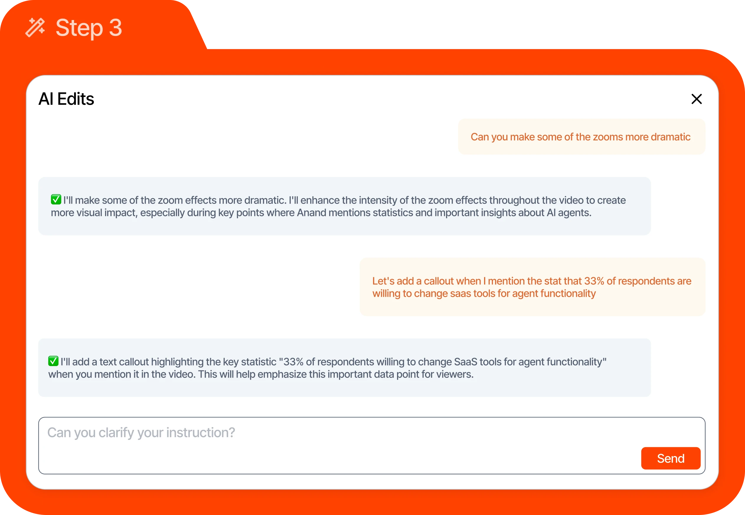 Your AI editor handles jump cuts, captions, zooms, music, scene changes. Tell it what you want—“hook them with a callout”—and publish polished clips with no delays.