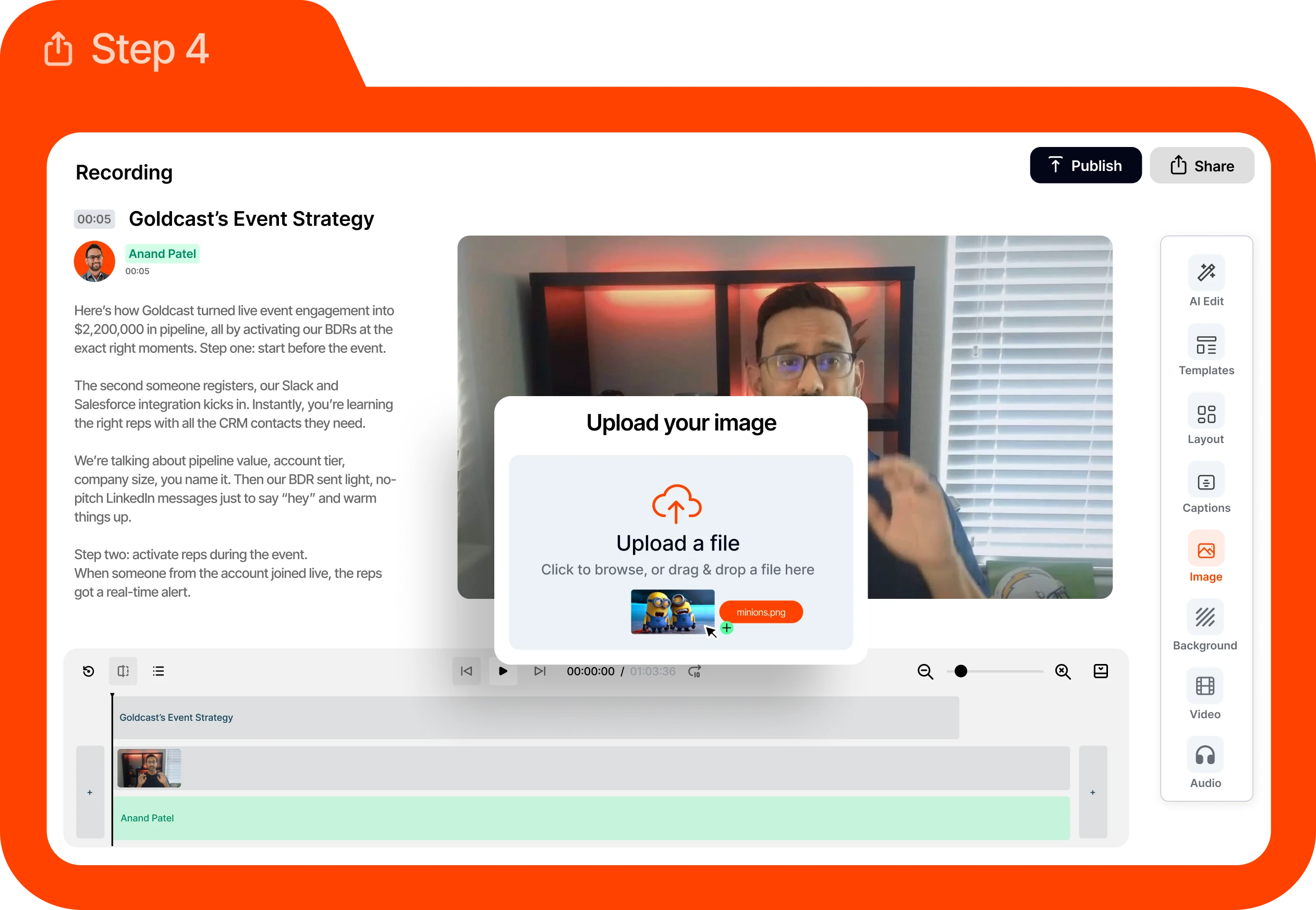 Run webinars and record videos in Goldcast. AI finds the best moments, spins out channel-ready clips, and unifies creating, editing, and distribution—end to end.