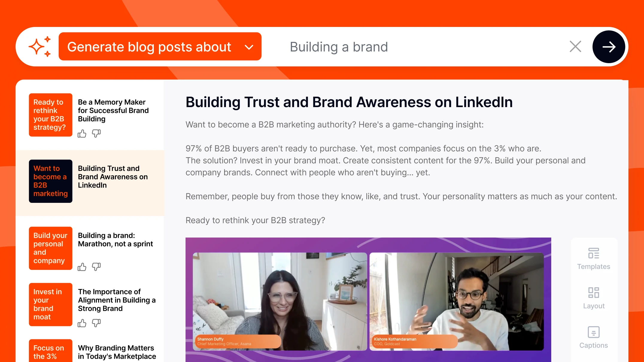 Effortlessly search for topics and themes across your video library and automatically generate clips, social posts, blogs, and more—boosting your content output.